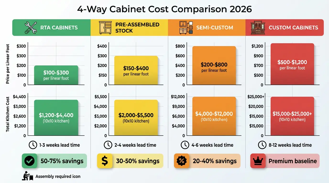 2. How much cheaper are RTA cabinets compared to pre-assembled or custom?